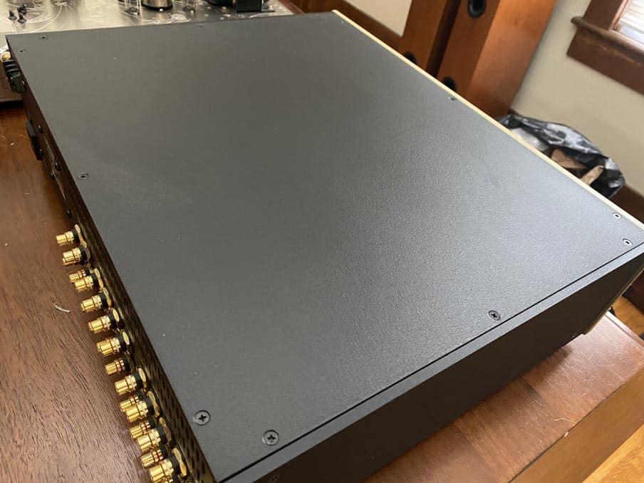 Tubes have been carefully hand selected for minimum noise and microphonics. The same CJD Teflon capacitors that distinguish the GAT are used in the ET5 for output coupling and post-regulator power supply storage. All other capacitors in the audio circuits and related power supplies are polypropylene or polystyrene – there are no electrolytic capacitors in the audio related circuits. The resistors in these circuits (including the two dozen level control resistors) are special low inductance, high-precision laser-trimmed metal foil resistors. Switches are sealed relays with gold-plated silver contacts. Input and output connectors are premium quality custom machined parts.