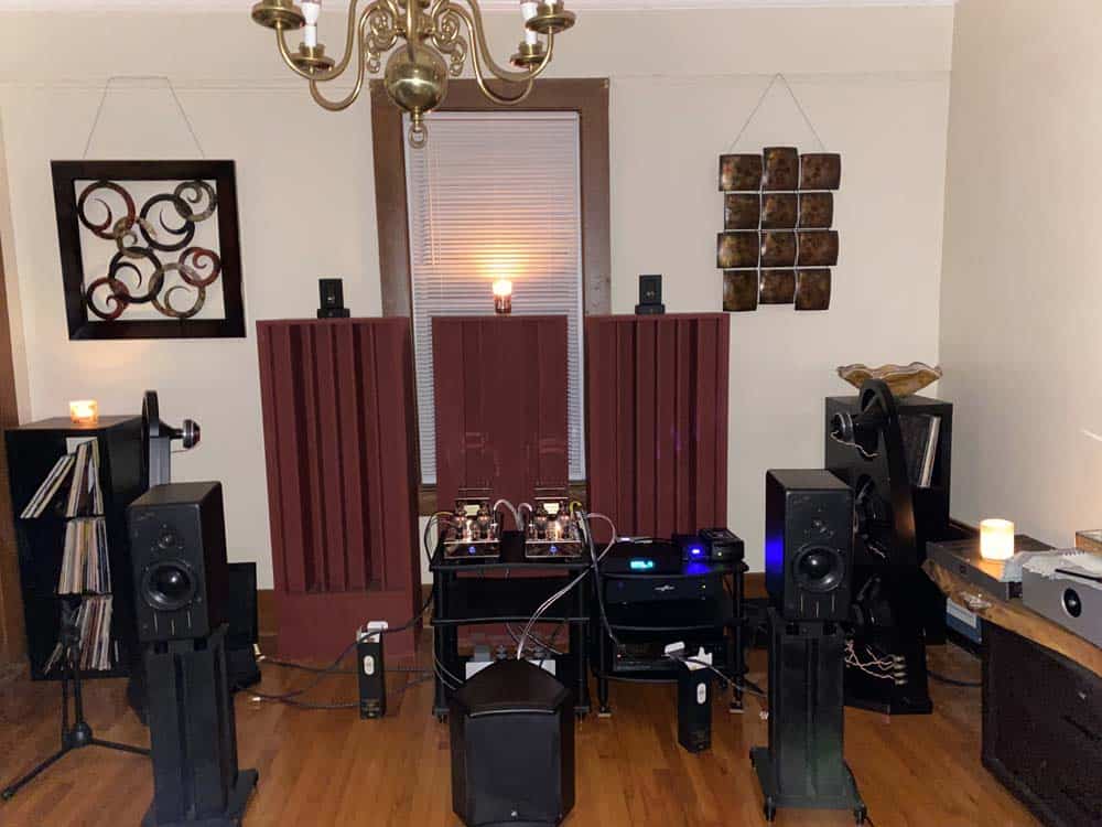 Placed atop my #100+ per side Target R3 stands they worked very well in an 18’x18’x9.5′ room, but as with the bigger VSMs, responded well to a pair of Aerial SW-12 subs.